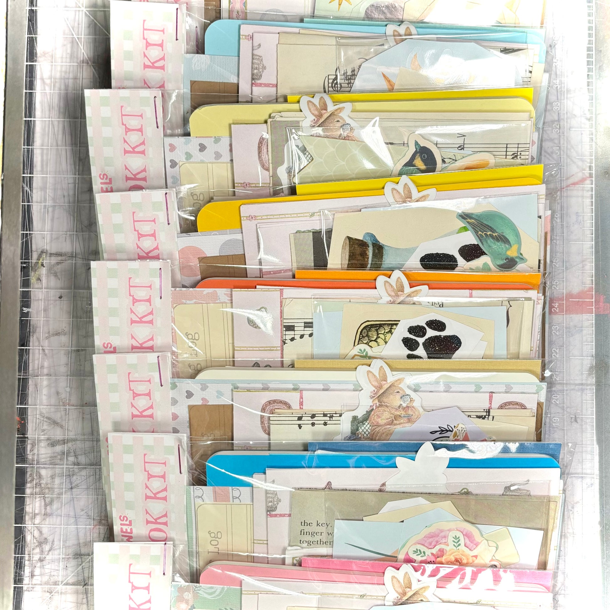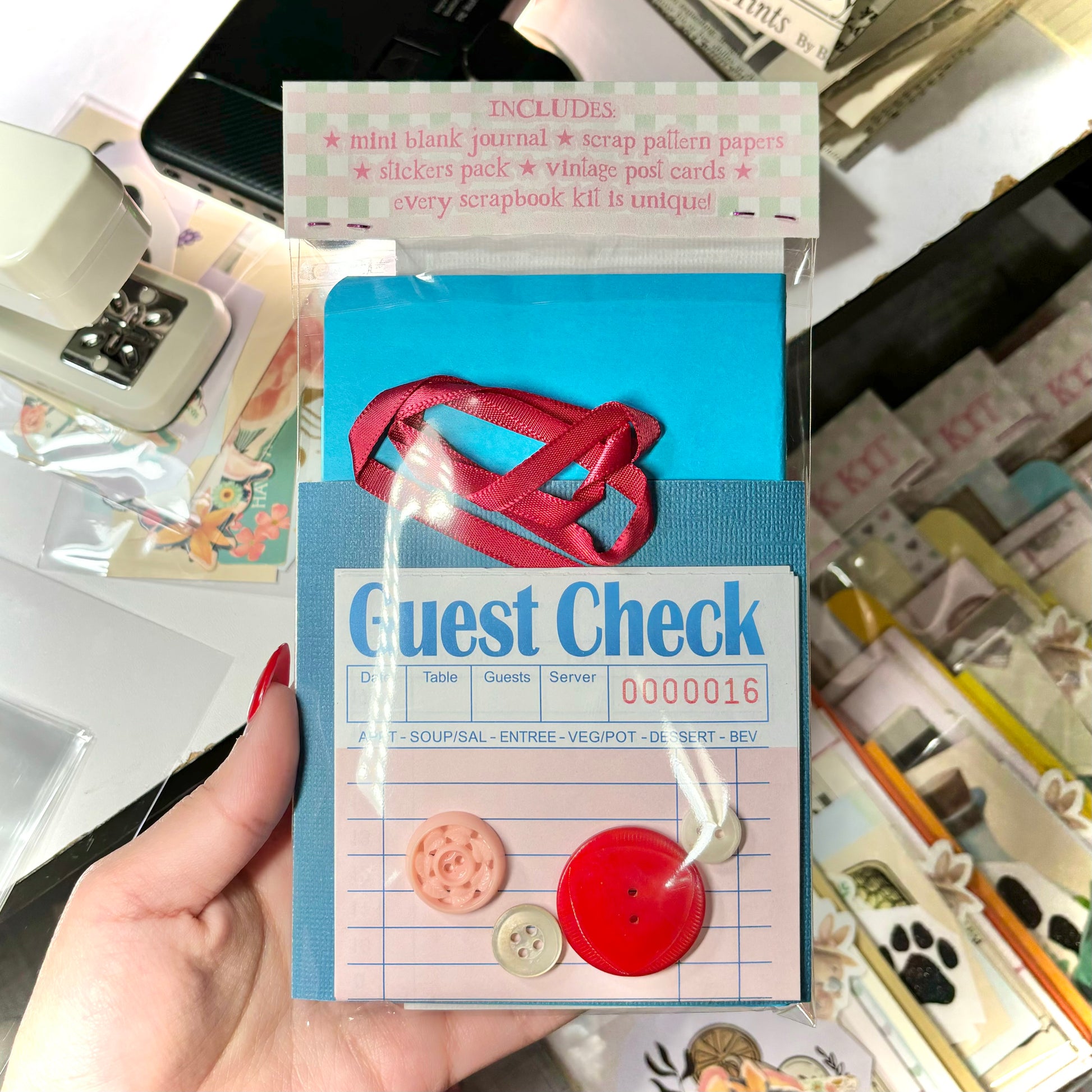 Each scrapbook kit includes a blank mini journal, sticker flakes, vintage letter cards, vintage book pages, a reading log bookmark, patterned paper, textured paper, lace and buttons, and guest checks. Perfect for scrapbooking, journaling or recording all the books you've read!